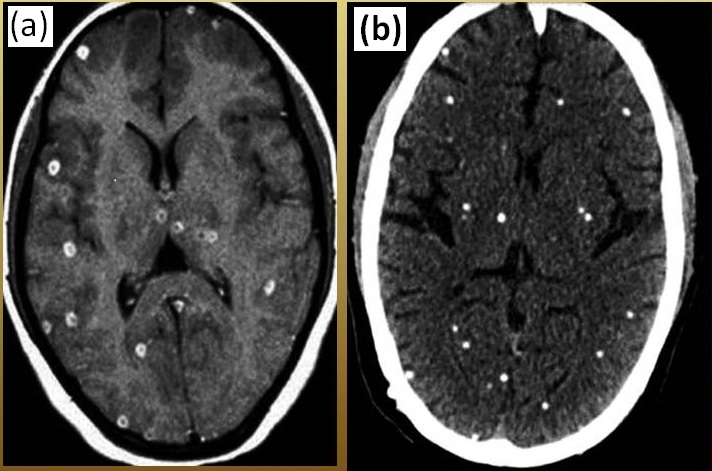 , (b) CT scan of calcified cysticerci (multiple)