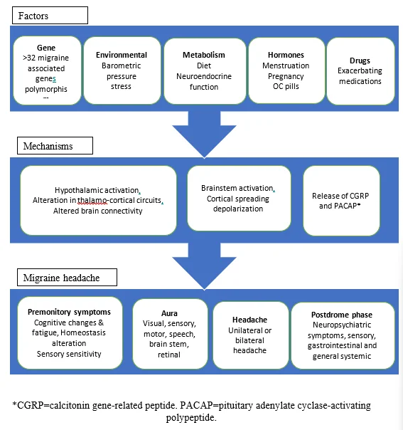 - Migraine headaches: Researchers have identified a number of genes that are associated with increased risk of developing migraine headaches. These genes are thought to play a role in regulating ion channels, neurotransmitter levels, and other aspects of brain function. For example, mutations in the CACNA1A gene, which encodes a calcium channel protein, can cause familial hemiplegic migraine, a rare and severe form of migraine [45]. Figure. 1 showing different risk factors, probable mechanisms and different stages of migraine risk factors.