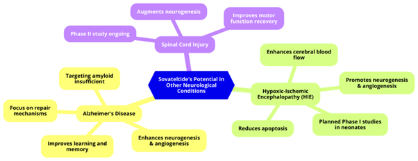 Hypoxic-ischemic encephalopathy (HIE) is a severe complication from oxygen deprivation at birth, leading to significant neonatal mortality and lifelong disabilities. Current treatments like therapeutic hypothermia have limitations, necessitating new therapies. Sovateltide has demonstrated significant neuroprotective and neuroregenerative effects in HIE animal models, reducing apoptosis, enhancing cerebral blood flow, and promoting neurogenesis and angiogenesis. These promising results suggest potential therapeutic benefits in HIE, leading to planned Phase I studies in neonates. Additionally, Sovateltide's ability to augment neurogenesis and improve motor function recovery after spinal cord injury is under investigation, with a Phase II study ongoing for patients with acute spinal cord injuries. This research indicates Sovateltide's potential across various neurological conditions, offering hope for improved outcomes in complex diseases (Figure 2).9